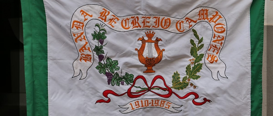 A watercolor on paper by Silvano Abreu Cardoso founder and conductor of the same band. It is framed with a photograph of the foundation of the Banda do Arco de São Jorge. The religiosity of its president is well evident in this image, in homage to the Blessed Virgin of Our Lady of Fátima. The Band is consecrated and delivered to the care of Our Lady of Fátima, patron of the group.