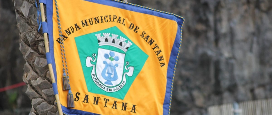 La bandera de la institución, de formato rectangular, en tela amarilla y margen a azul tiene en el centro un pentágono de fondo verde (color del municipio), debajo del cual descansa el escudo, constituido por lectura de cuatro cuerdas, en azul, en chef, ramo de hortenses con el mismo color. En la parte superior del escudo hay una corona de cinco torres de plata, que identifica al municipio con sede en la ciudad y en la base, se une al blanco, con la fecha de fundación en negro: «Fundada em 4-4-1926». Bajo el pentágono, la denominación «Banda Municipal de Santana»…