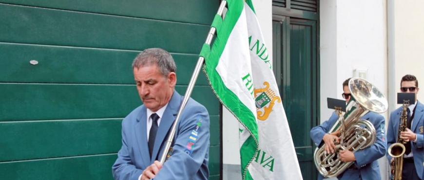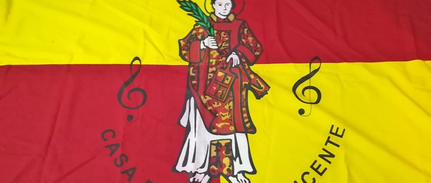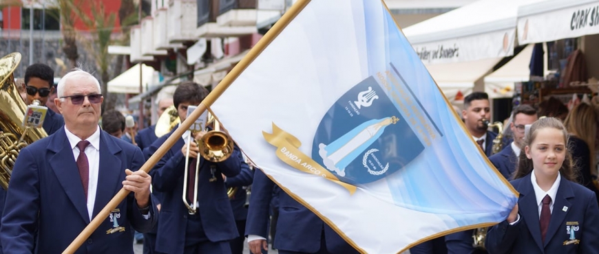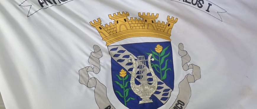 En el centro de la bandera rectangular en tela blanca, es el emblema de la institución, que consiste en la lectura de color marrón y la silueta en el fondo blanco de Nossa Senhora, con halo amarillo, escudo suizo en dos colores, fondo verde izquierda y azul a la derecha; en contracabeza, banda blanca con el nombre «Banda Arco S. Jorge». El escudo está flanqueado por tres hojas de vacío (incluidas en el escudo de armas) y, junto a la base, por racimo de uvas. Debajo del emblema, la lista superior de fondo lila con la leyenda negra «Ass. Rec.…