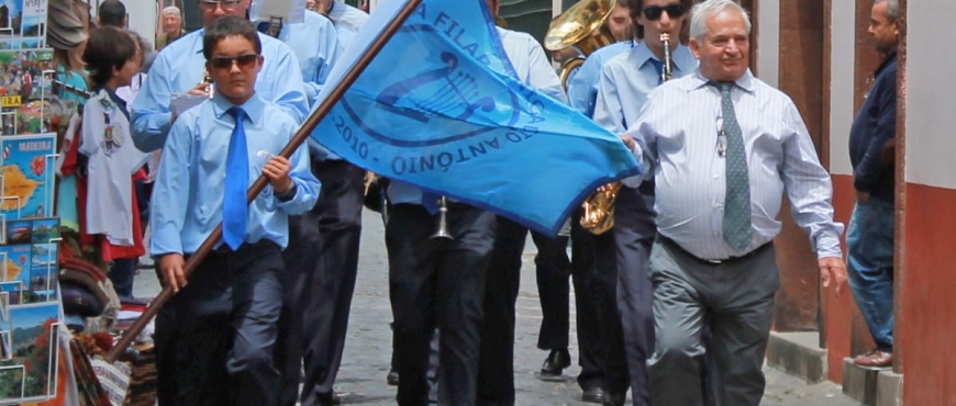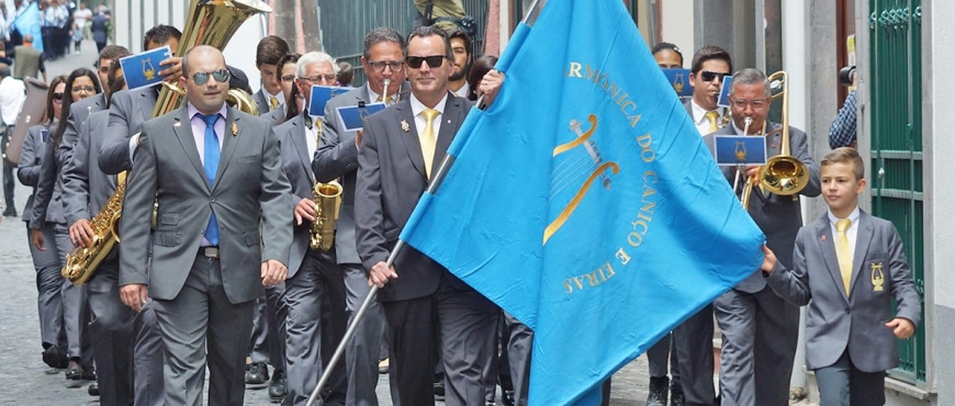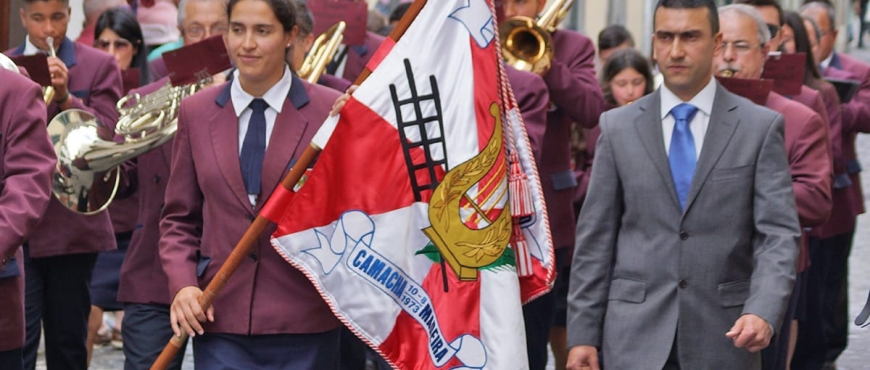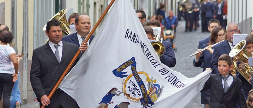 La bandera, en tela blanca y formato rectangular, lleva en el centro un anillo dorado, superpuesto por una banda de fondo azul y con el nombre amarillo «Philarmonica Artistico-Madeirense», que se inscribirá debajo, en negro, en la parte inferior del anillo , la fecha de fundación, «Fundada em 09-IX-1872». Sostenido por el extremo superior derecho del anillo, la imagen del guardián celestial y de las formas victoriosas del malvado guerrero, São Miguel Arcanjo, ángel y patrón de Portugal y mecenas de los oficiales de policía y militares. En la parte inferior exterior del anillo, aparece en oro la primera denominación…