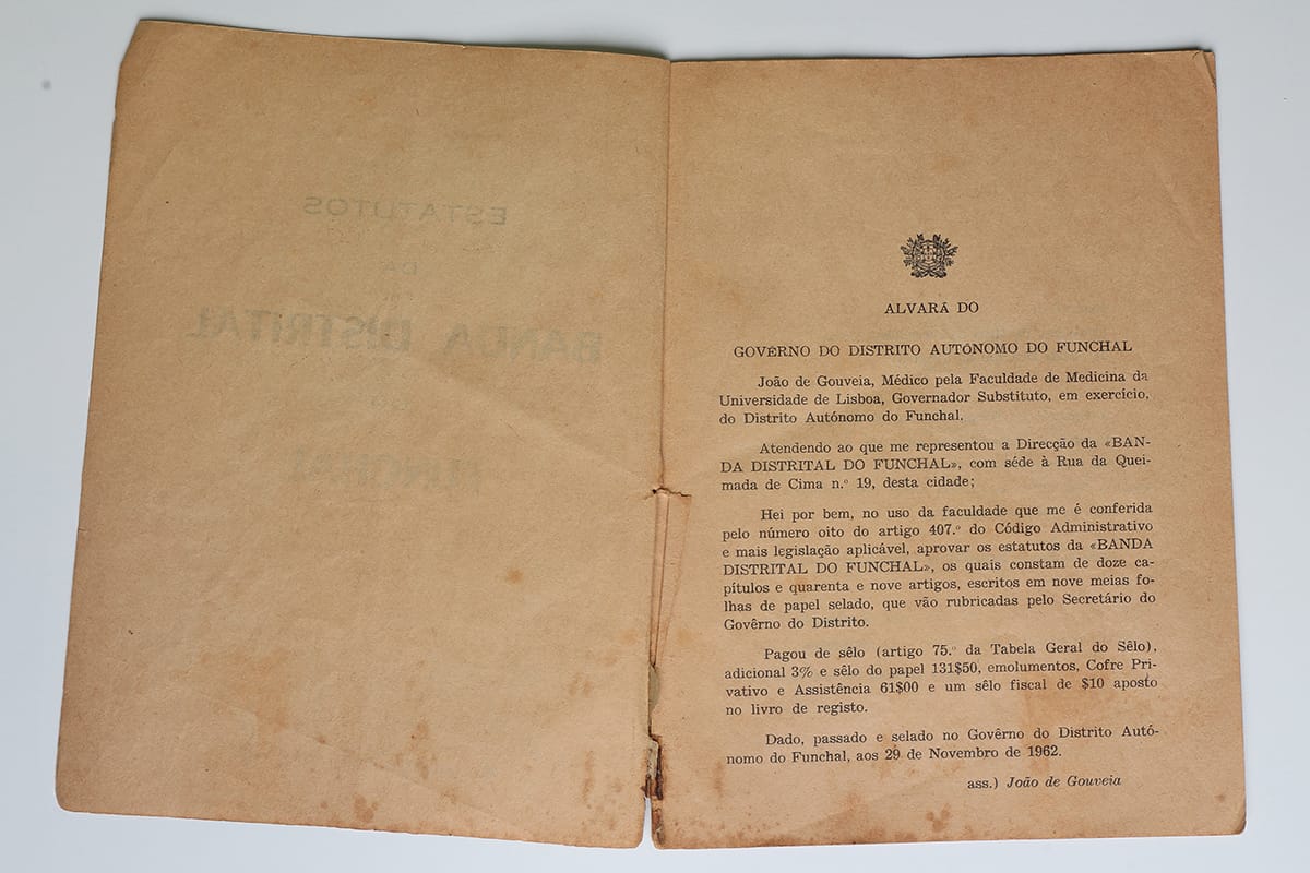 La Banda Distrital do Funchal a dans ses domaines un livre de statuts, du 9 novembre 1962, que nous considérons comme le plus ancien. Une particularité de ces statuts est qu’ils ont été dactylographiés et imprimés, habituellement les statuts ont été manuscrits dans les procès-verbaux dans certains cas.