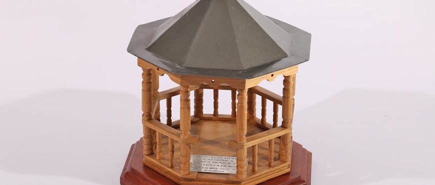 L’objet que nous voyons sur l’image est un trophée qui a été offert à la Banda Municipal do Funchal qui a participé au Festival de Orchestre Philharmonique de Ponta do Sol organisé par la Banda Municipal da Ponta do Sol depuis 2001. Cet objet est une réplique d’un kiosque qui existait auparavant, et où les groupes exécutent leurs performances.